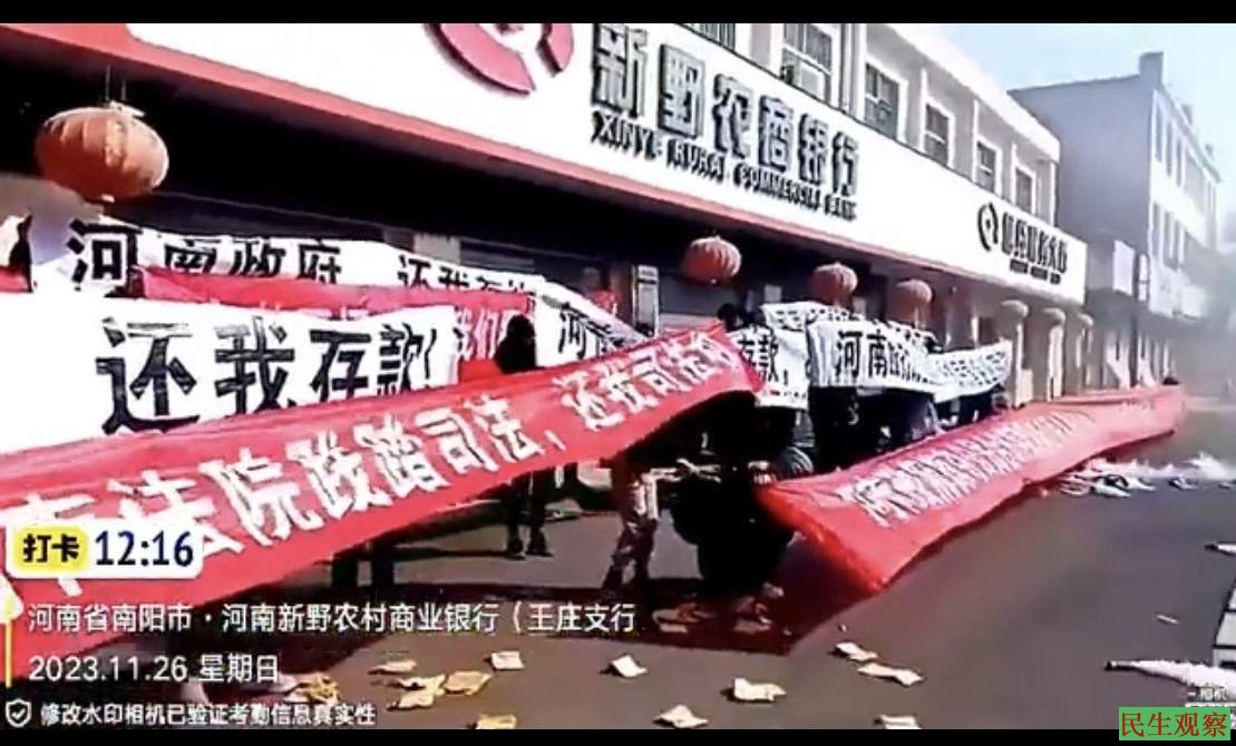 【民生观察2023年11月30日消息】2023年11月26日,河南村镇银行储户们再次前往河南南阳拉横幅抗议,要求归还自己的存款。随后他们被全部逮捕。