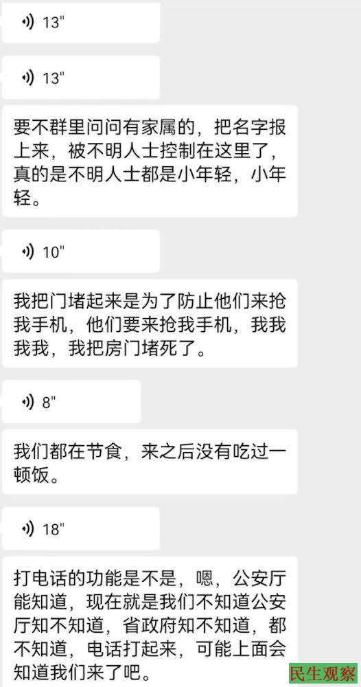 我们都在绝食,来到这里之后没有吃过一顿饭。现在我们只能偷偷向外发消息,不敢接打电话怕被外面的红马甲听见。你们可以打电话向外面求救,把我们的情况传出去。”