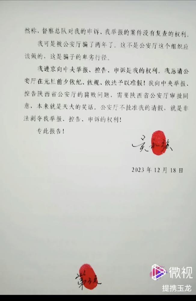吴永强是陕西省公安厅治安局二处民警。此前,吴永强通过治安局向厅党委发出“最后通牒”,并请假,也买了2023年12月17日进京车票,可是,12月18日,杜厅长要求他进京要有专门的请假报告,故有了这个请假报告。