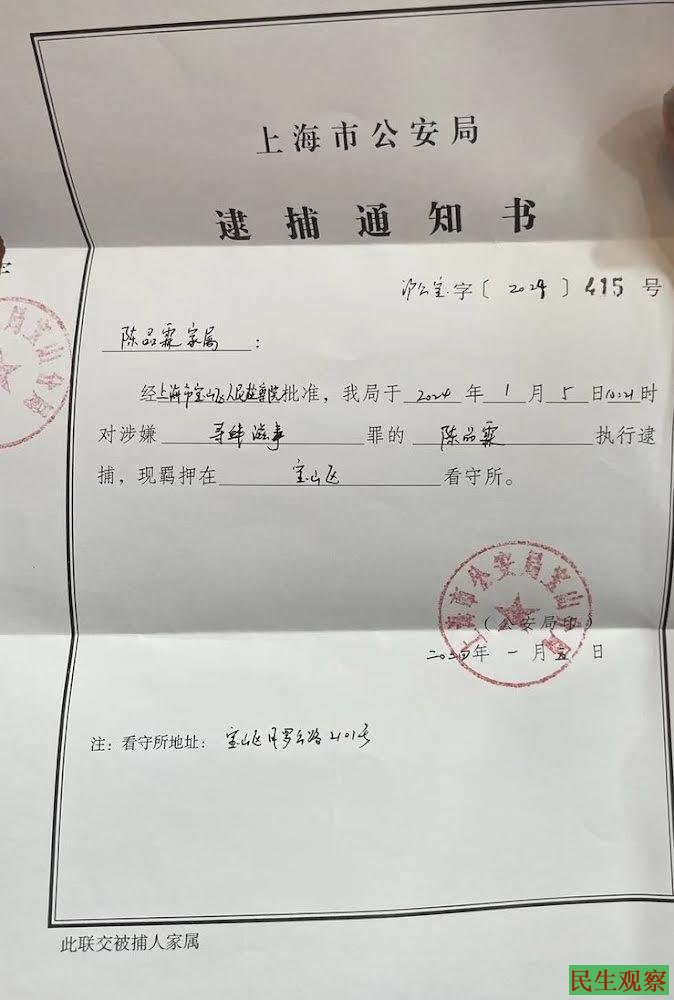 据悉,陈品霖被关押在上海市宝山区看守所,已于2024年1月5日被以涉嫌寻衅滋事罪批捕,2月18日案件被移送检察院审查起诉。
