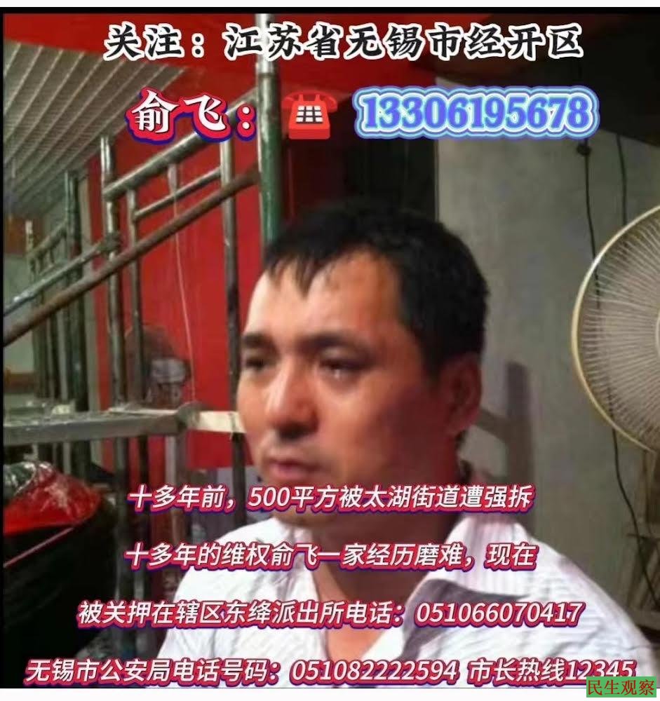 2024年3月10日,俞飞前往北京国家信访局反映房屋被强拆至今不赔偿的问题,被警方拦截后带到府右街派出所关押,期间失去联系。