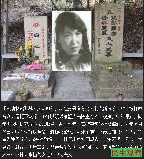 附简介:林昭,原名彭令昭,苏州人。1954年,以江苏最高分考入北大新闻系。1957年被打成右派,但拒不认罪。6年后以阴谋推翻人民民主专政罪被捕;1962年保外,同年再次以扩充反革命罪收监,判刑20年。在狱中饱受折磨催残,1968年04月29日,以“现行反革命”罪被秘密枪决。