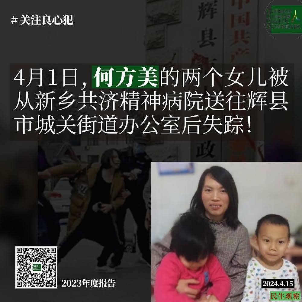 【民生观察2024年6月2日消息】河南辉县何方美、李新夫妇是疫苗受害家长,因为孩子疫苗致残维权先后被抓捕关押判刑。夫妇俩人被抓捕判刑后,其3个年幼的孩子分别被滞留在河南新乡共济医院和寄养在农户家中。2024年4月,何方美的2个女儿不知何故,被送至河南新乡辉县城关镇镇政府办公室,其后不知所踪,家属多方找寻无果,2个孩子至今下落不明。今天是“六一”儿童节,何方美关注组发文质询,何方美的两个女儿到底在哪里?据称,此前一直关注何方美一家的何方美姐姐遭到辉县有关人员的威胁恐吓,同样关注何方美一家的李新姑姑则处于失联状态。