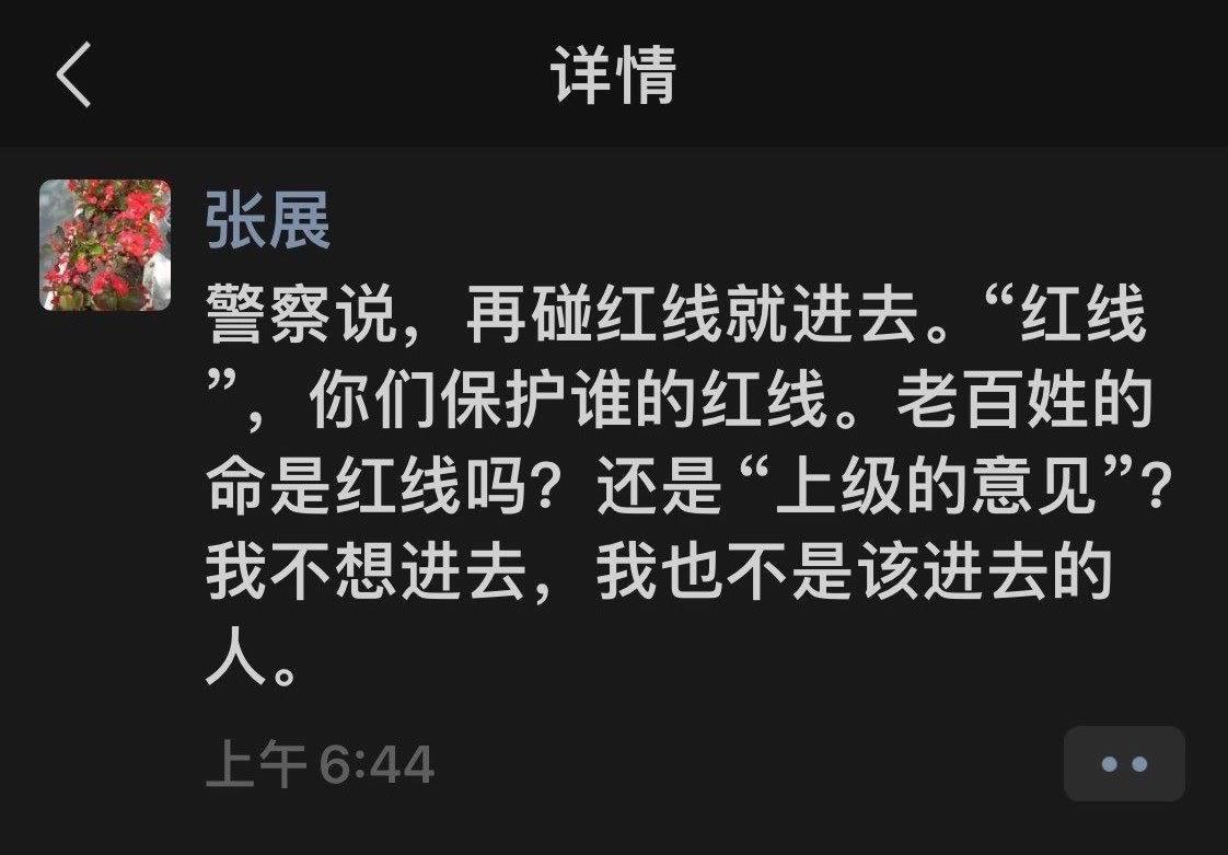2024年6月9日,据张展微信朋友圈显示:警察说,再碰红线就进去。“红线”,你们保护谁的红线。老百姓的命是红线吗?还是“上级的意见”?我不想进去,我也不是该进去的人。