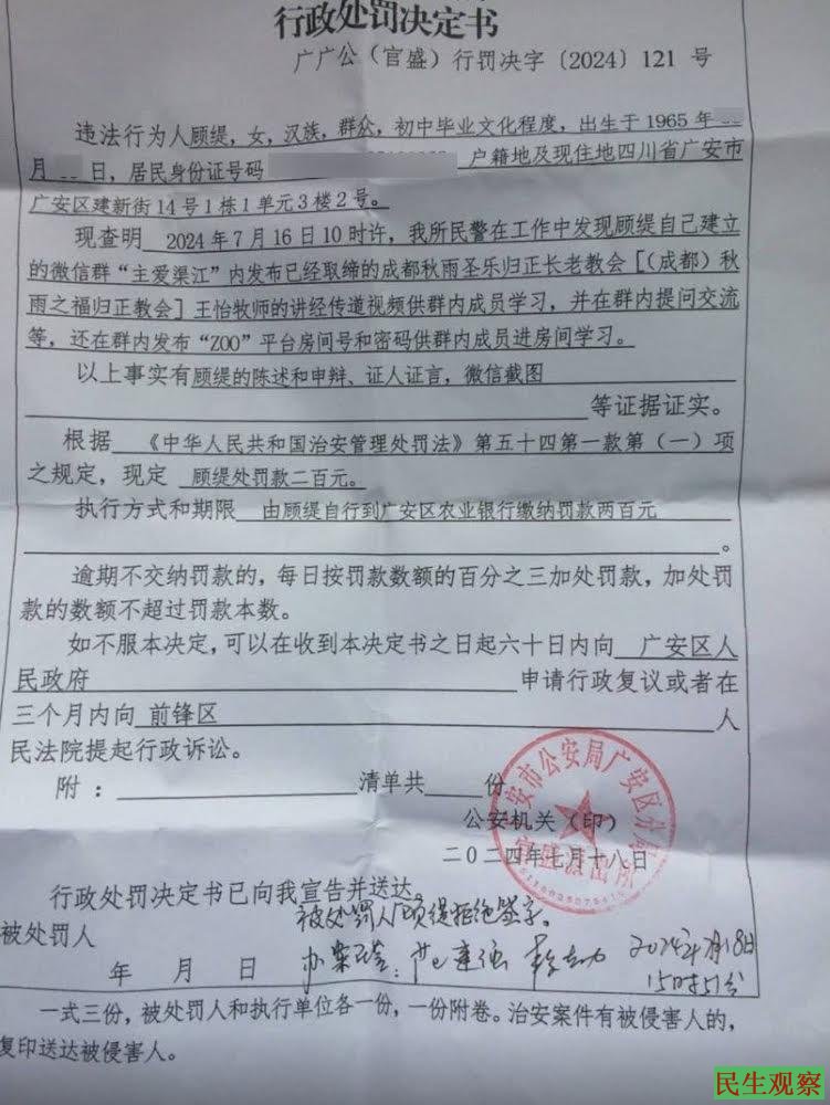 【民生观察2024年7月19日消息】近日,四川省广安市顾缇姊妹因为在微信群转发成都秋雨之福圣约教会王怡牧师的证道视频,被四川省广安市公安局广安区分局处以行政处罚。