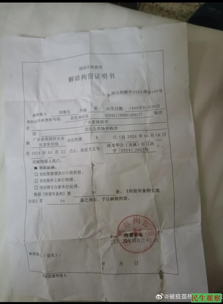 【民生观察2024年7月24日消息】深圳打工人刘春生的女儿刘梓悦,因接种疫苗出现严重的异常反应,经治疗后留下严重的后遗症导致残疾,刘春生向深圳相关部门多次讨要说法,不但遭到推诿,还被深圳警方多次打压拘留。