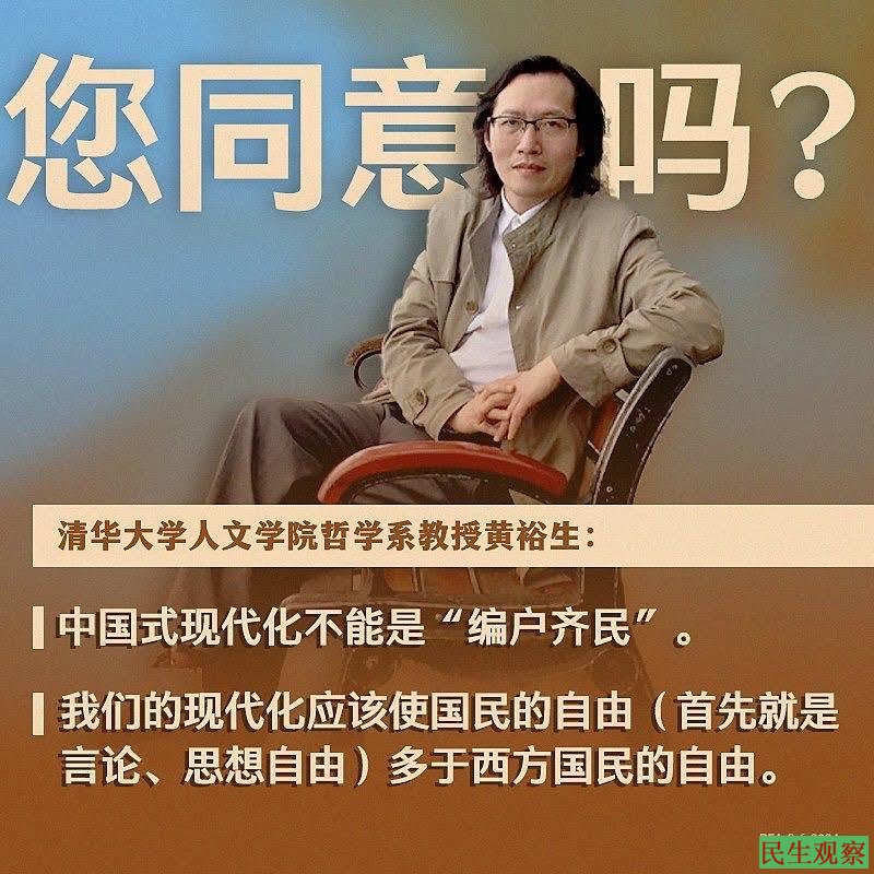 黄裕生教授表示,如果中国式现代化是我们的目标与方向,那么,这个方向不是朝向古老的“编户齐民”,而应朝向人人更加自由、更加开放、更加自立、更加文明与更加富有。如果我们对中国式现代化要有信心,要有自信,那么这种现代化应该对国民的监控少于西方现代化对其国民的监控。换个角度说,我们的现代化应该使我们的国民的自由(首先就是言论、思想自由)多于西方国民的自由。