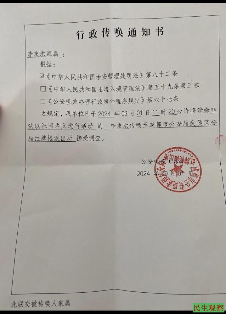 【民生观察2024年9月3日消息】2024年9月1日主日上午,成都秋雨圣约教会在一处租用的场地进行线下聚会,随即遭到成都警方的冲击。李英强长老、吴五清传道、晏鸿长老(通知书上写的李友洪)以及曾庆涛副执事先后被警察带走传唤。至9月2日中午时分,得知四人均被警方以非法社团名义进行活动为由处于行政拘留。