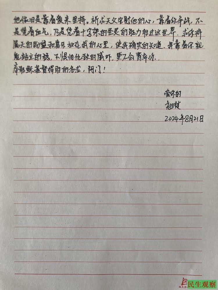 【民生观察2024年9月4日消息】北京人权护卫者李翘楚于2024年8月3日刑满获释,至2024年9月3日已经出狱一个月了,其在家人和友人的陪同下前往医院就诊,目前身体状况有所好转。另翘楚写给男友许志永的2封书信,志永已经收到,并已给她回了信。