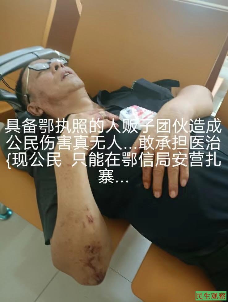 【民生观察2024年9月9日消息】近日,湖北省武汉市武昌区维权访民童斌乘坐火车前往北京信访,刚出车站就遭湖北驻京办人员的拦截,被绑架上黑车以后押送回武汉,期间押送人员抢夺童斌手机,造成童斌身体多处受伤骨折,要求就医被拒,到达武汉后童斌砸汽车玻璃报案自首欲求医治疗,随后被带往派出所作笔录。日前,童斌前往派出所索要案件立案告知书,却无人理睬。