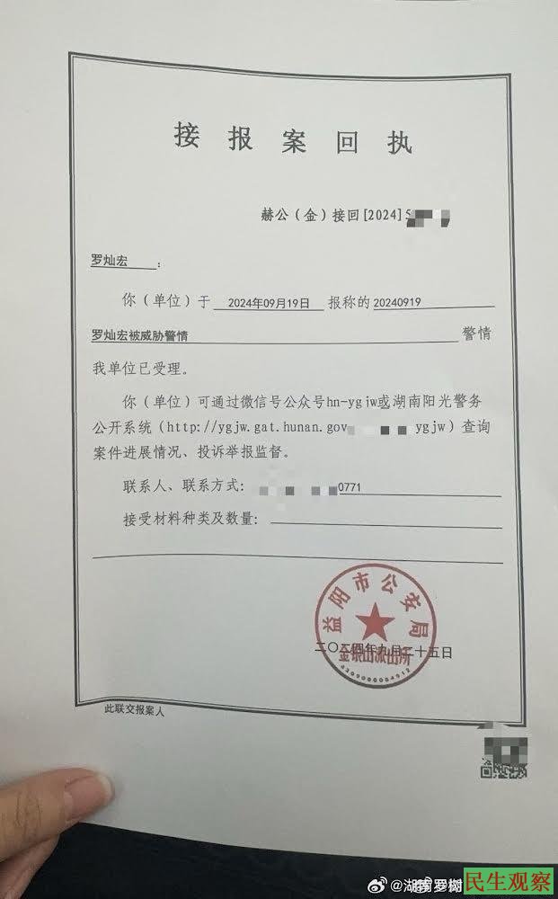 【民生观察2024年10月1日消息】湖南益阳罗灿宏的父亲罗树中因遭受刑讯逼供,蒙受冤屈,罗灿宏为替父维权,一直通过网络直播呼吁大家关注罗树中案件的进展。近日,罗灿宏遭到一名为“蔡明辉”的人连续私信死亡威胁。报警后,至9月29日案件无任何进展,不得已罗灿宏向益阳市公安局金银山派出所递交了要求提级办理案件的书面申请书。