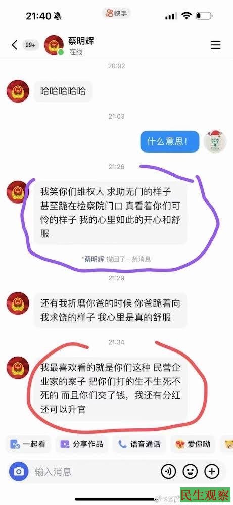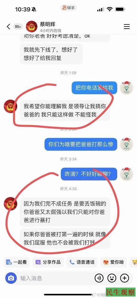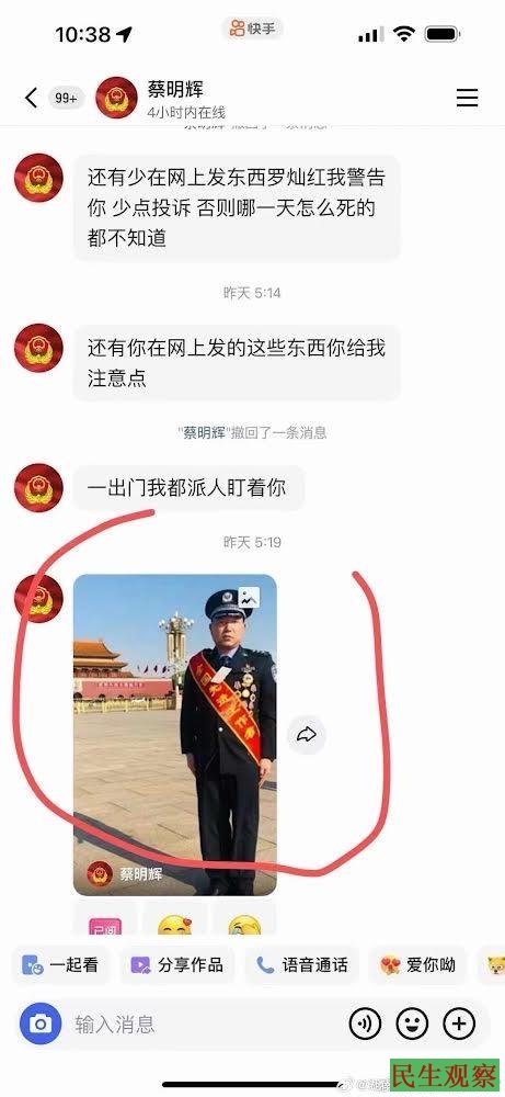 因罗树中(申请人父亲)遭受刑讯逼供,蒙受冤屈,申请人为替父维权,一直通过网络直播呼吁大家关注罗树中案件的进展。2024年9月19日凌晨20分,申请人收到了自称是益阳414案办案人员“蔡明辉”的信息,“蔡明辉”通过快手平台向申请人发私信称:“你还在网上乱说,小心怎么死的都不知道!”