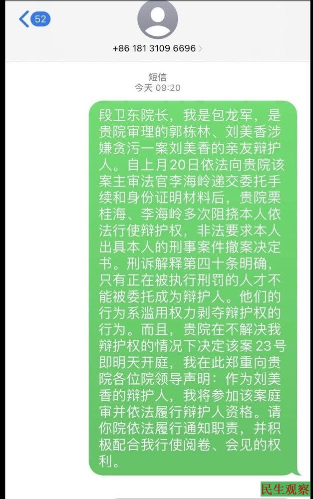 因为刘美香案明天(10月23日)即将开庭,情事紧迫。今天,包龙军给该院院长段卫东发信息,不回,又打电话,不接。