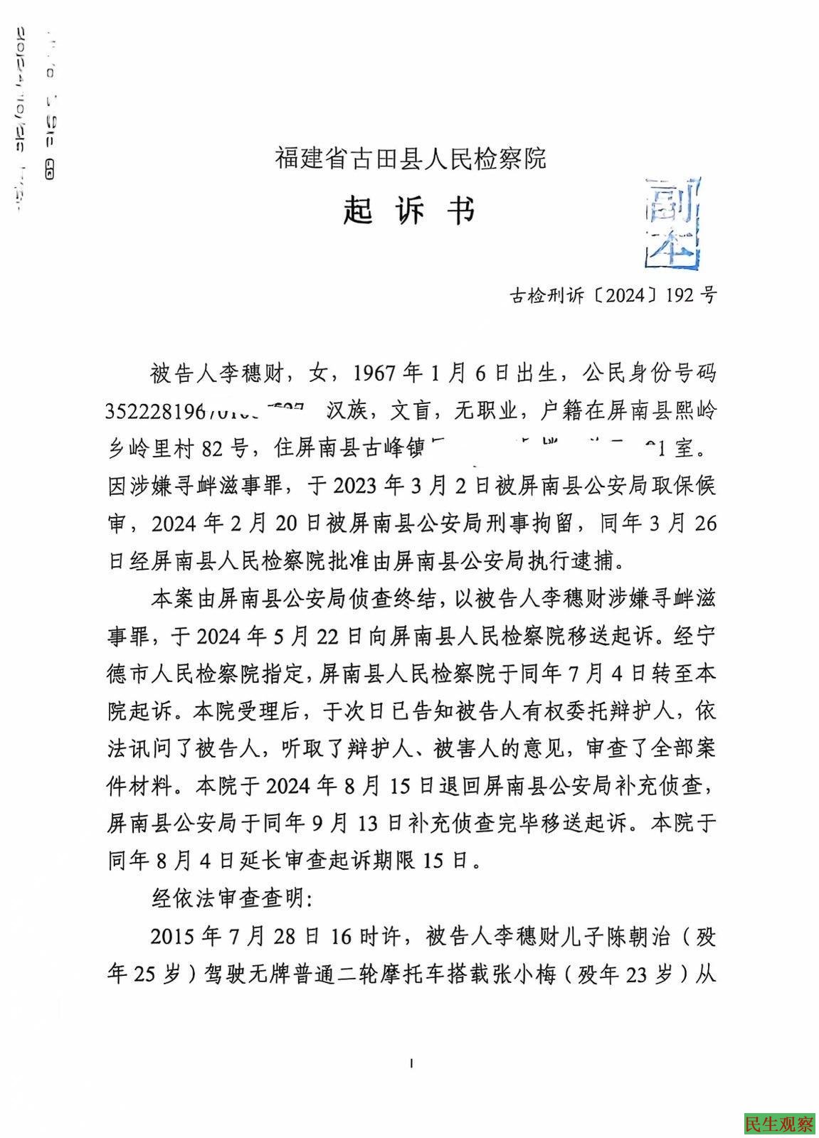 福建省屏南县维权公民李穗财,今年58岁,她原有一个独生子陈朝治,因儿子在一起交通事故中死亡,事故鉴定结论3次都不一样的结果,鉴定结论明显说两人的死亡与莫明辉摩托车碰撞有直接的因果关系,交警划分责任及其不公,疑点重重,莫明辉车撞人,撞死两个人,任何责任都没有,导致这位失独母亲不断寻求真相为死去的儿子讨说法。交通案情回顾: