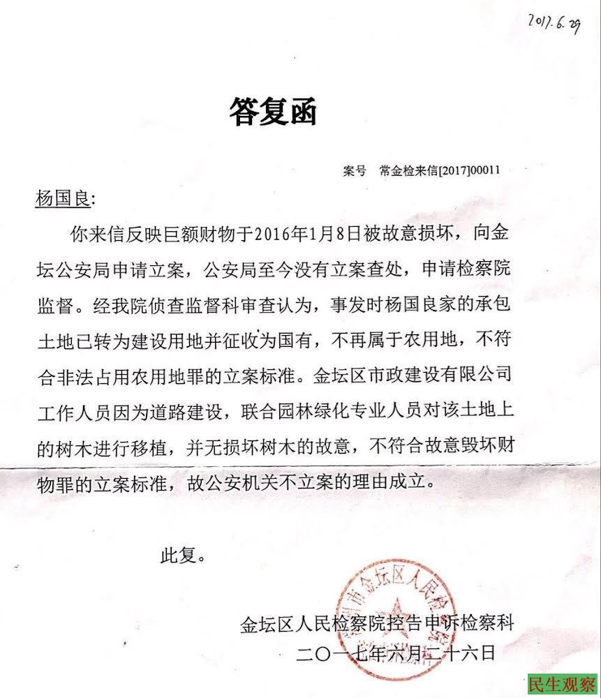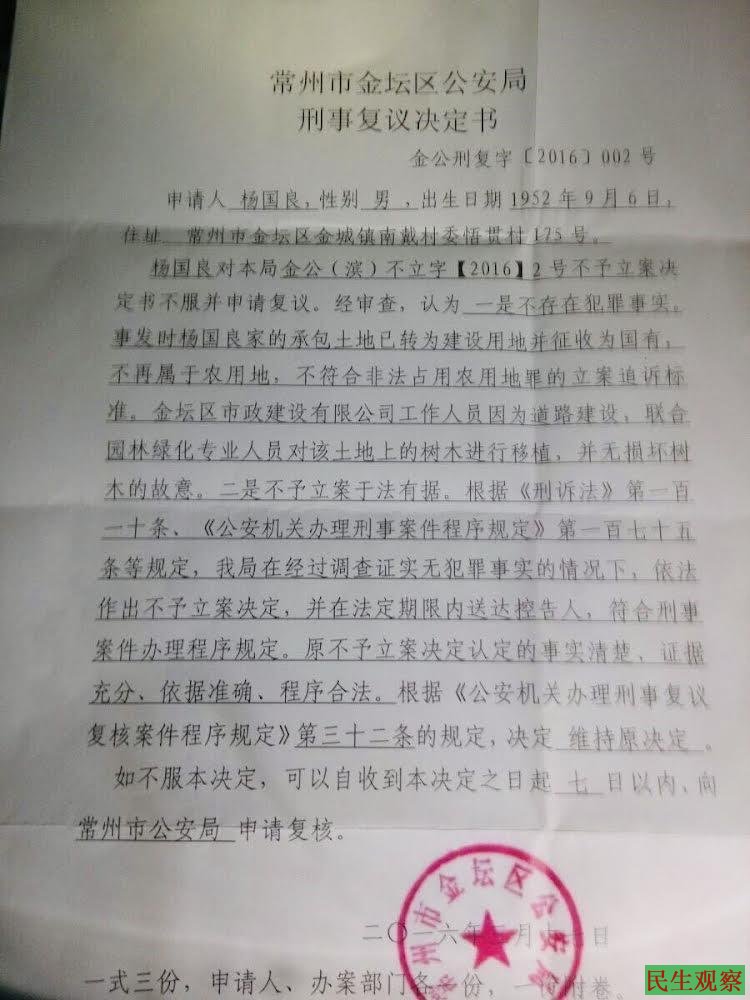 2016年,许冬青家遭地方国企非法毁树占地,金坛公安与检察院在土地没有被征收的情况下公然造假,以土地已被征收为国有建设用地、无犯罪事实为由压案不立。事实上,金坛国土局在2015年7月17日就已经作出了认定用地国企违法占用335.30亩的土地行政处罚决定。对应征地批复也是在违法占地建设2年后的2018年2月9日由江苏省政府作出。