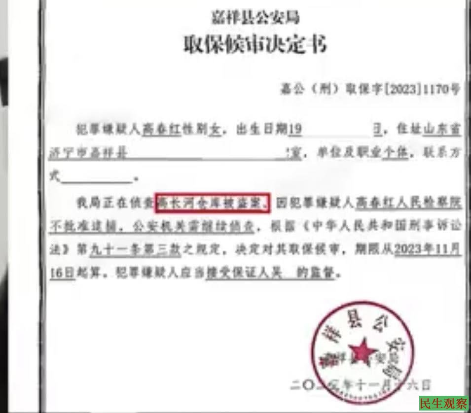 2023年10月10日,警方以高春红在“高长河仓库被盗案”中涉嫌“寻衅滋事罪”为由,对高春红刑事拘留,而高春红和“高长河仓库被盗案”没有关联,她没去过案发地点,没有接触过涉案财物,没有发表过相关言论。