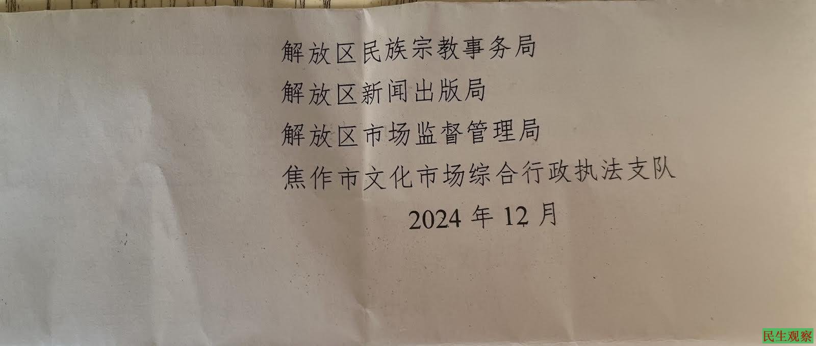 文件虽然没有盖任何公章,却署名了民族宗教事务局、新闻出版社、市场监督管理局、文化市场综合行政执法大队。由于物业方不允许其朋友对文件内容进行拍摄,所以只拍摄了文件的署名。(请见下图)