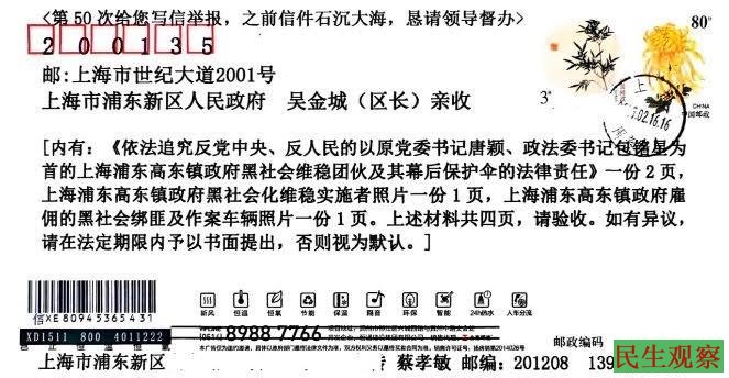 截止2025年2月16日,蔡孝敏给上海浦东区政府吴金城区长邮寄的50封信访件均石沉大海。