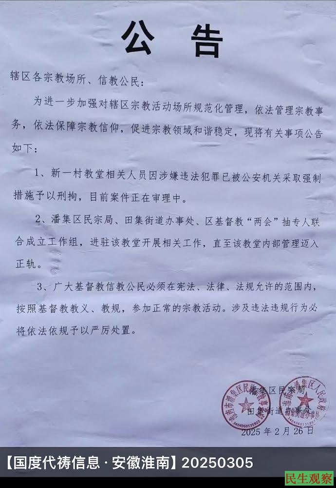 2025年2月26日,潘集区民宗局与田集街道办事处联合发布一份公告称,“辖区各宗教场所、信教公民,为进一步加强对辖区来教活动场所规范化管理,依法管理宗教事务,依法保障宗教信仰,促进宗教领域和谐稳定,现将有关事项公告如下: