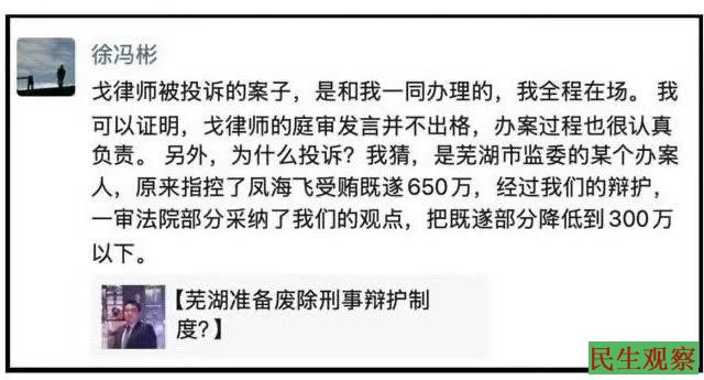 之后,北京的徐冯彬律师为此在朋友圈作证说:“戈律师被投诉的案子,是和我一同办理的,我全程在场。我可以证明,戈律师的庭审发言并不出格,办案过程也很认真负责。另外,为什么投诉?我猜,是芜湖市监委的某个办案人。原来指控了凤海飞受贿既遂650万,经过我们的辩护,一审法院部分采纳了我们的观点,把既遂部分降低到300万以下。”