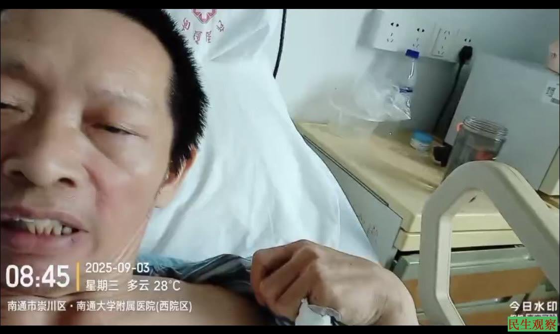 【民生观察2025年9月6日消息】2025年8月底,江苏如皋维权人士张岳兵在自家门口被村干部带人围殴,后被送进南通附属医院住院治疗,在其身体情况有所好转,但还未完全痊愈的情况下,于9月3日大阅兵当天,张岳兵被要求出院,同时医院也停止给他治疗。