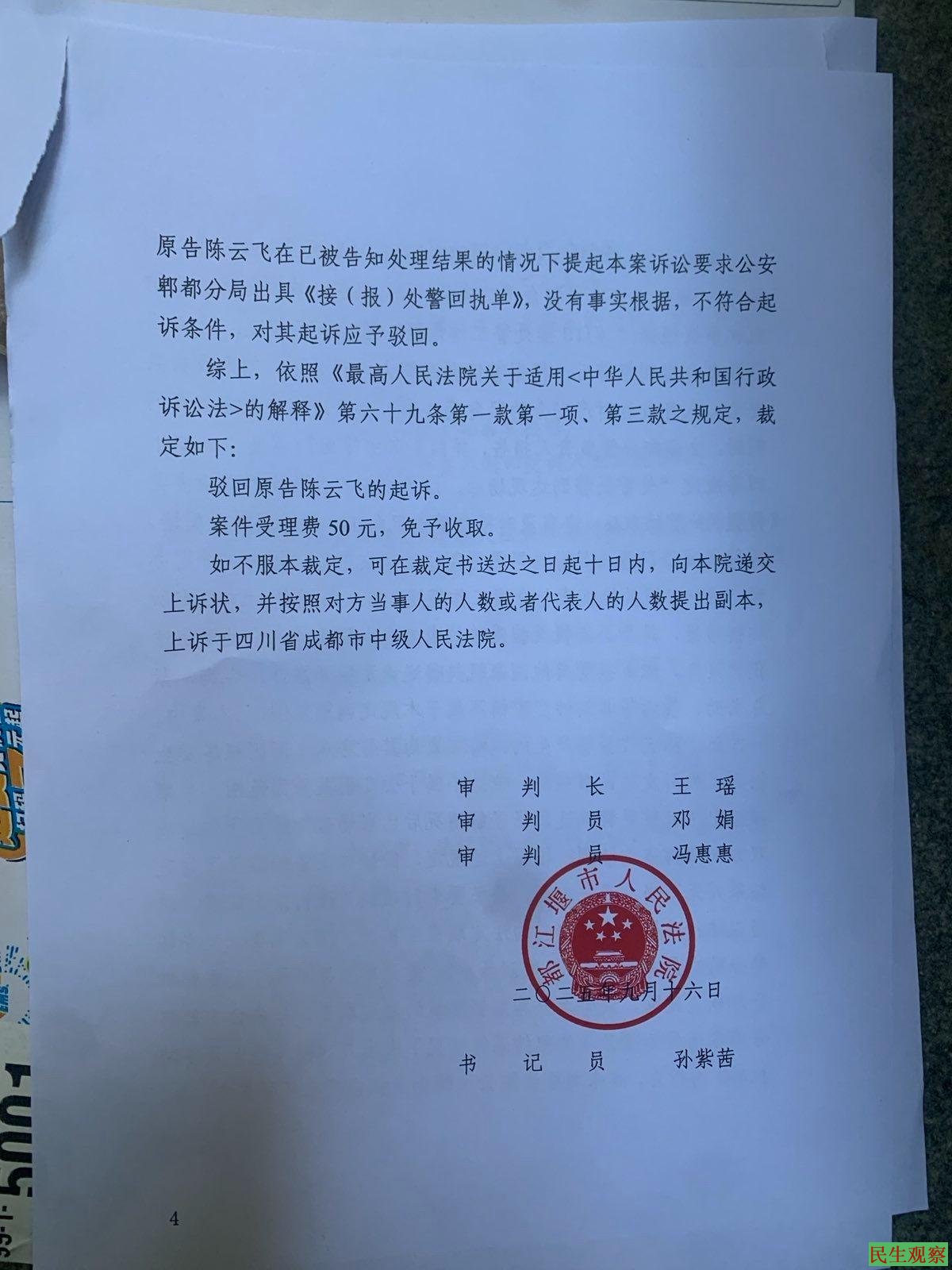 9月19日,成都都江堰人民法院书面给陈先生邮了个驳回起诉的裁定!
