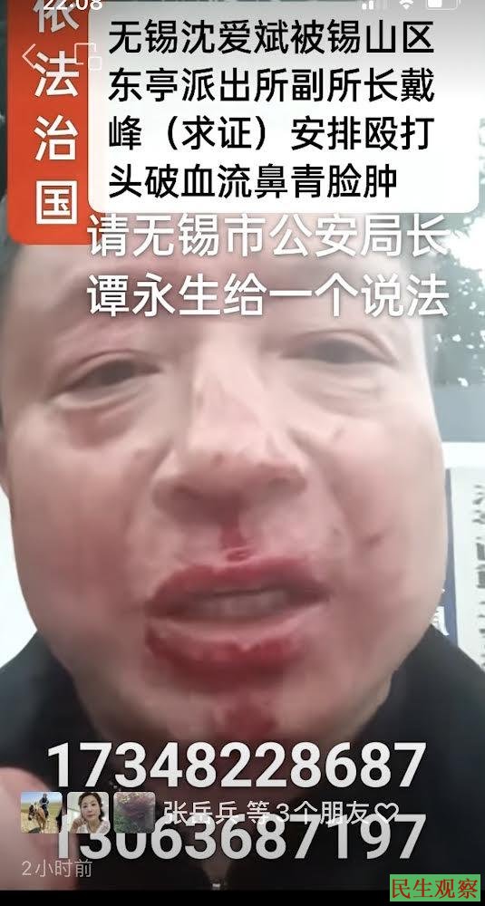 2025年10月27日下午5时许,沈爱斌在无锡市公安局锡山分局东亭派出所,被该所副所长戴沣(警号:221928)先无故抢走手机,后又指挥十几人对其殴打。导致其鼻梁骨被打坏了,满脸流血。
