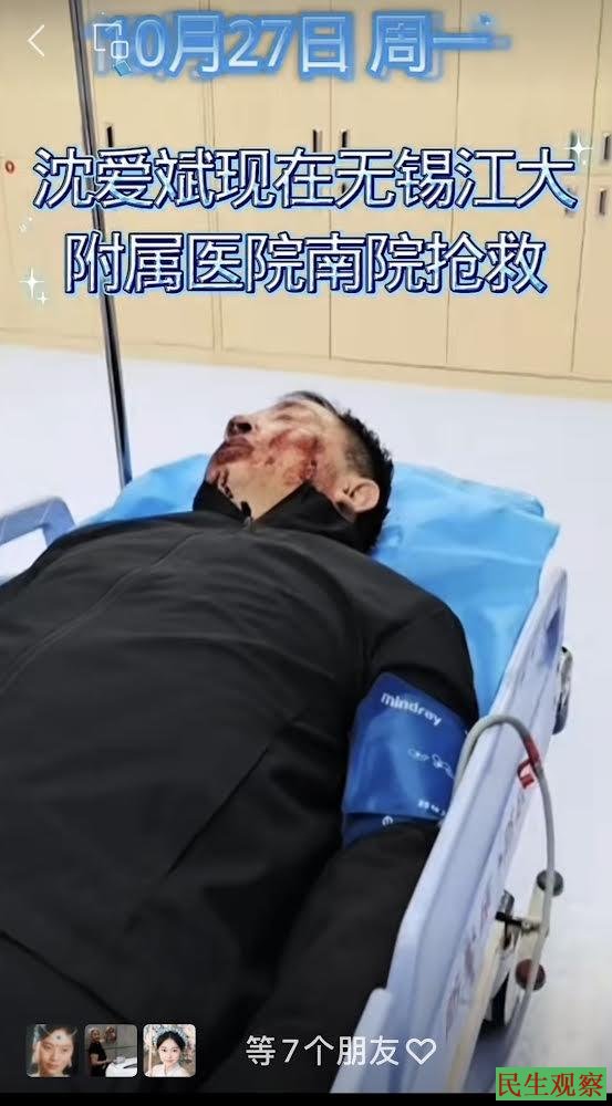 随后沈爱斌被送往无锡市江大附属医院南院进行抢救,目前其户籍所在地派出所派来一个警察在医院病房“保护他”。