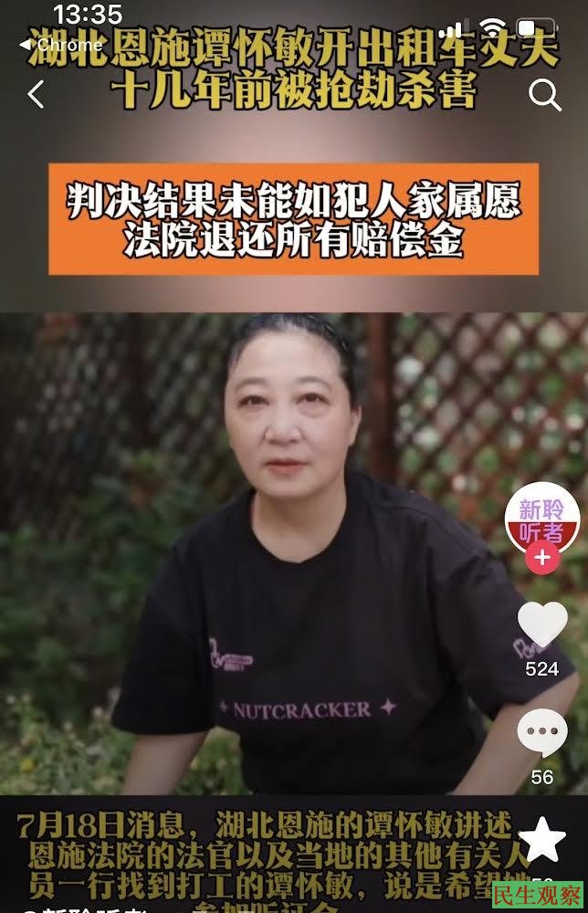 据了解,谭怀敏是因为十几年前开出租车的丈夫被一伙人抢劫杀害,并且损毁了车辆,法院判决民事赔偿50万元,却始终没有到账,为此其一直信访并产生了寻衅滋事等一系列案件。