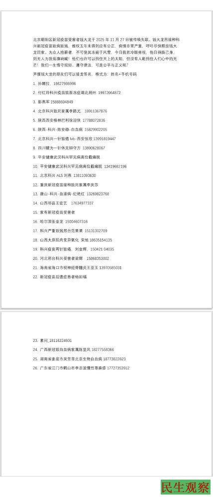 【民生观察2025年12月2日消息】中国新冠疫苗受害者至今已维权三年整,近期中国政府升级对新冠疫苗受害者的打压迫害。北京新冠疫苗受害者钱大龙人再次被“消失”,微博账号被消失,钱大龙所建的微信群也被消失。另外,近日关注声援钱大龙失联事件者,亦遭到警察的上门骚扰。