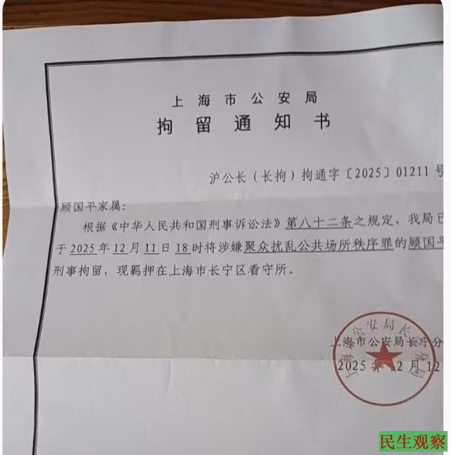 【民生观察2025年12月14日消息】国际人权日当天,上海长宁访民顾国平因与访民聚餐并拉了一个小小的横幅,随后多人被传唤至派出所作笔录,顾国平则被以涉嫌“聚众扰乱公共场所秩序罪”刑拘,现羁押在上海市长宁区看守所。