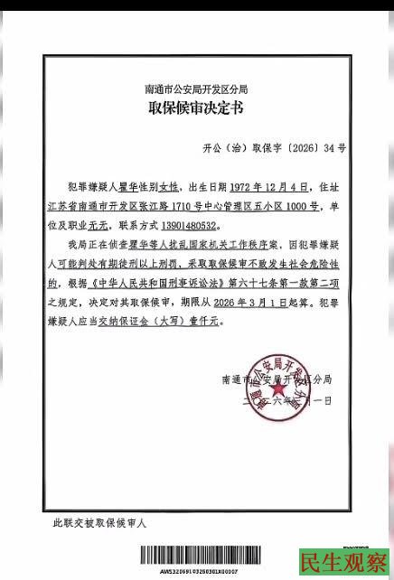 【民生观察2026年3月2日消息】近日,江苏南通开发区维权人士瞿华,被南通警方上门带走传唤,涉嫌罪名扰乱国家机关工作秩序,在被关押24小时后,警方又对瞿华强行作出取保候审的决定。
