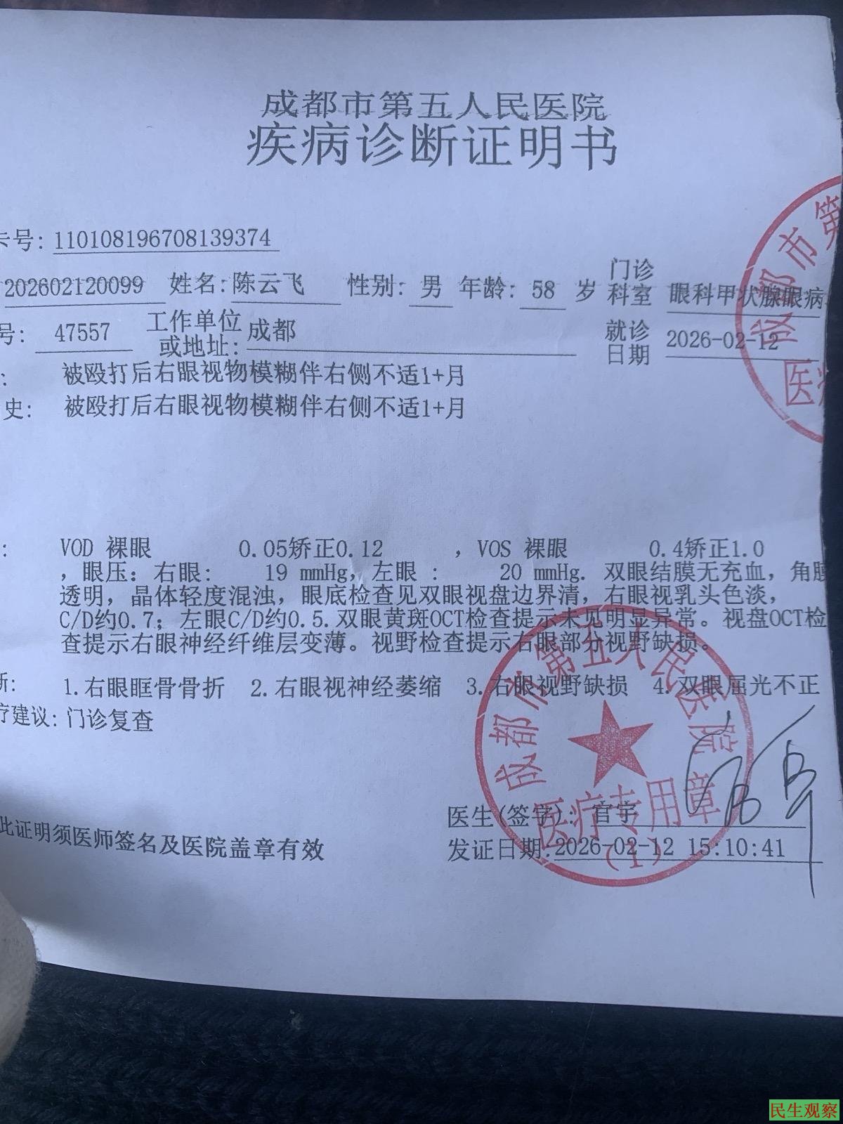 2月9日陈先生在国际知名人权律师卢思位的陪伴下,到犀浦派出所领取鉴定报告。当陈先生拿到鉴定报告后,当场表示不服,并签字要求重新鉴定。因为陈先生被殴打一个月以来,他被打右眼睛一直疼痛,视力下降迅速并出现盲区,眼角到鼻孔前端麻木。这样陈先生希望找医院再检查,然陈先生找了多家医院,均表示设备简陋做不出来。2026年2月11日、12日陈先生在成都第五人民医院做了检查,在报告出来后,陈先生电话询问及请求成都旭日司法鉴定中心根据我做的补充病历再做一次伤情鉴定。起初他们说可以,需要派出所再开委托。