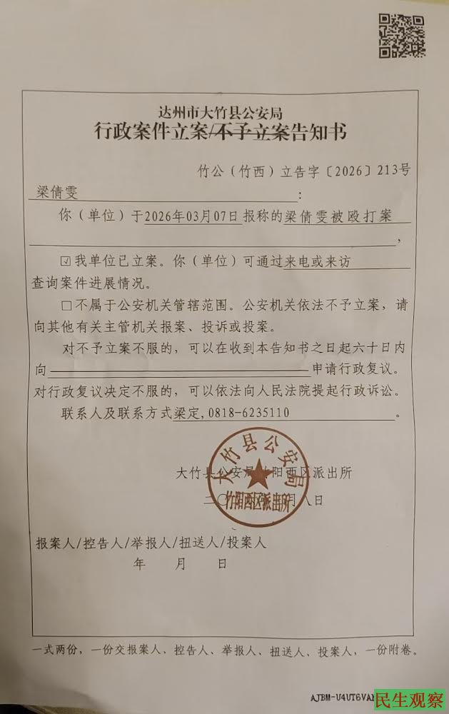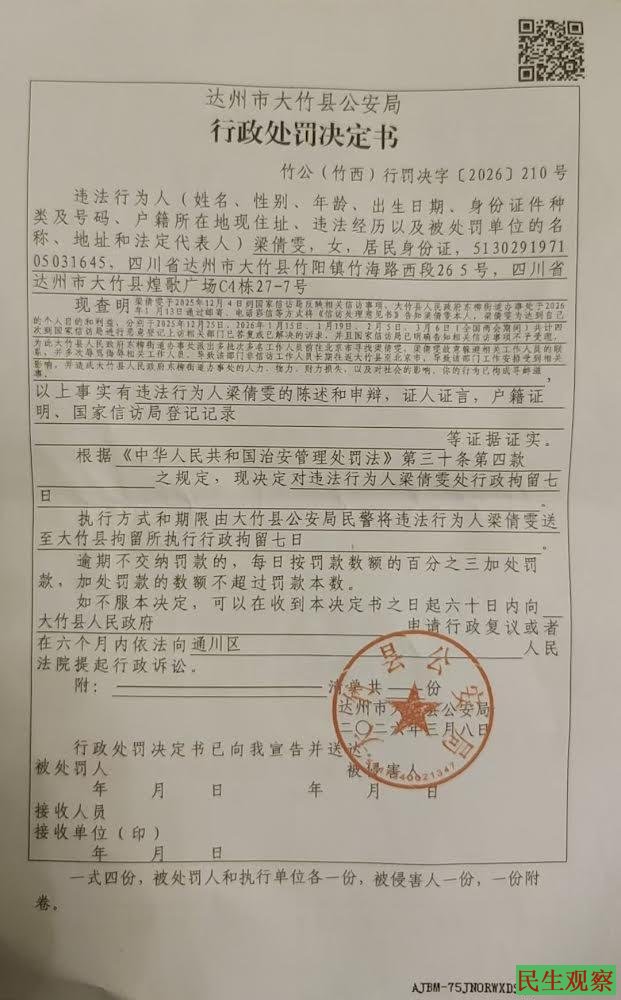 【民生观察2026年3月16日消息】今年两会期间,四川省达州市大竹县访民梁倩雯,在京期间遭截访人员绑架后殴打,其报警维权反被达州大竹县警方非法拘留7天。获释后的梁倩雯于近日,实名举报达州市大竹县公安局和大竹县玉林社区相关人员,并要求追责。
