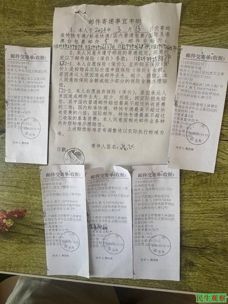 【民生观察2026年3月20日消息】今年3月上旬,现居广州白云区的湖北蕲春青年高飞,向有关国家机关正式邮寄《守卫生命底线:关于全面审查并暂停人体器官移植业务的紧急倡议书》,现显示相关邮件已签收。随后,高飞接到广州白云区公安局电话,告知公安部已接收到该倡议书。近日,高飞有接到老家村委的电话,告知近期将有蕲春公安及村镇人员抵粤约见。