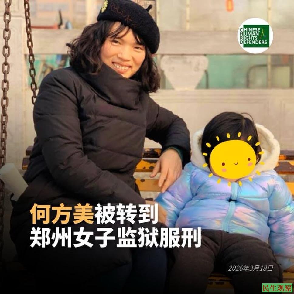 【民生观察2026年3月21日消息】疫苗受害家长何方美因为女维权遭当局判刑5年6个月。近日,家属得知何方美已被移送中牟县郑州女子监狱服刑。