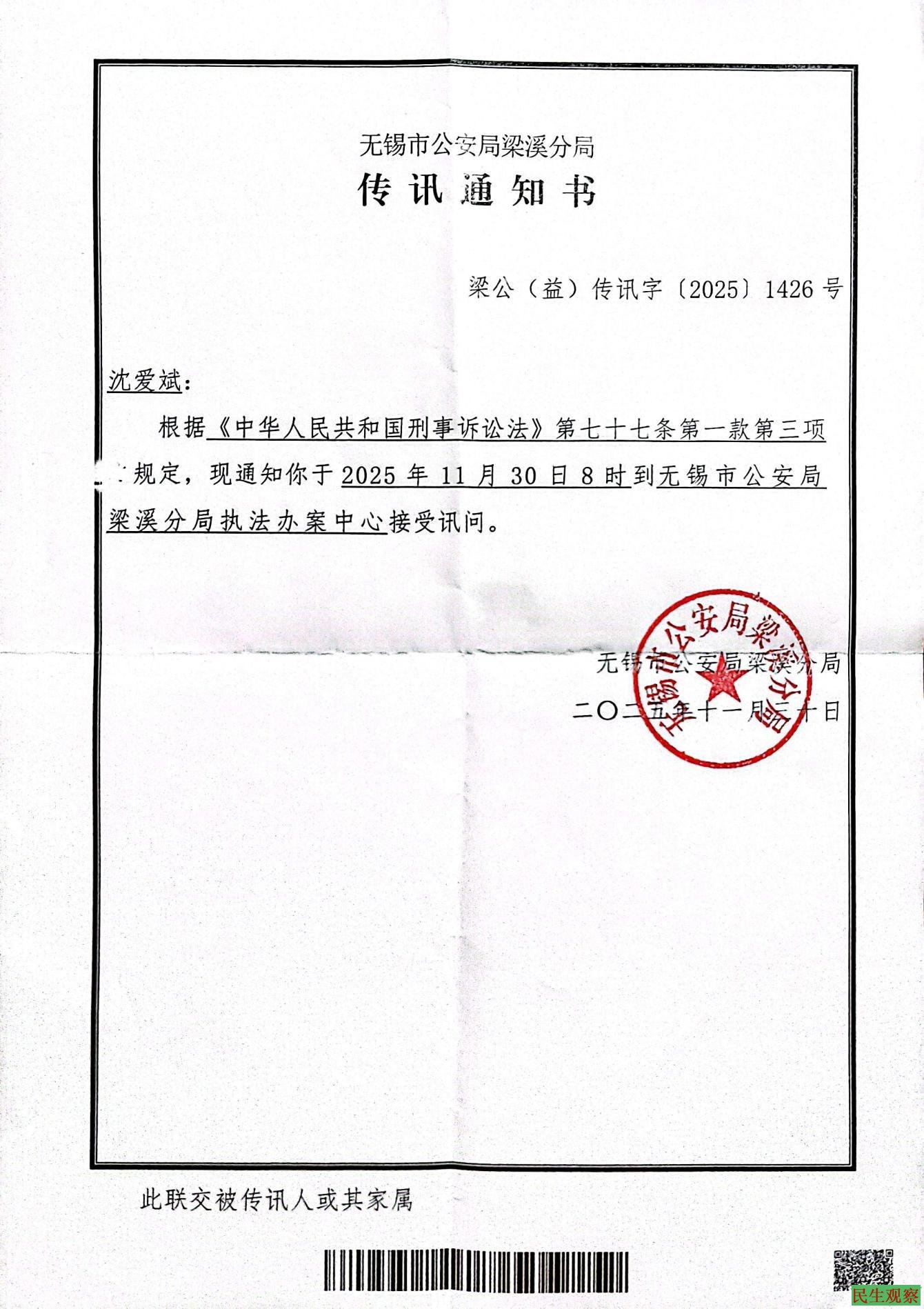 (三)2025年9月24日沈爱斌到南京京西宾馆向中央第五巡视组举报其遭遇无锡黑恶司法败类灭绝人性的系列暴行迫害,南京市公安局鼓楼分局滥权将沈拦截后移交给无锡梁溪公安,梁溪公安分局以阻碍执行职务违法行为拘留10天。