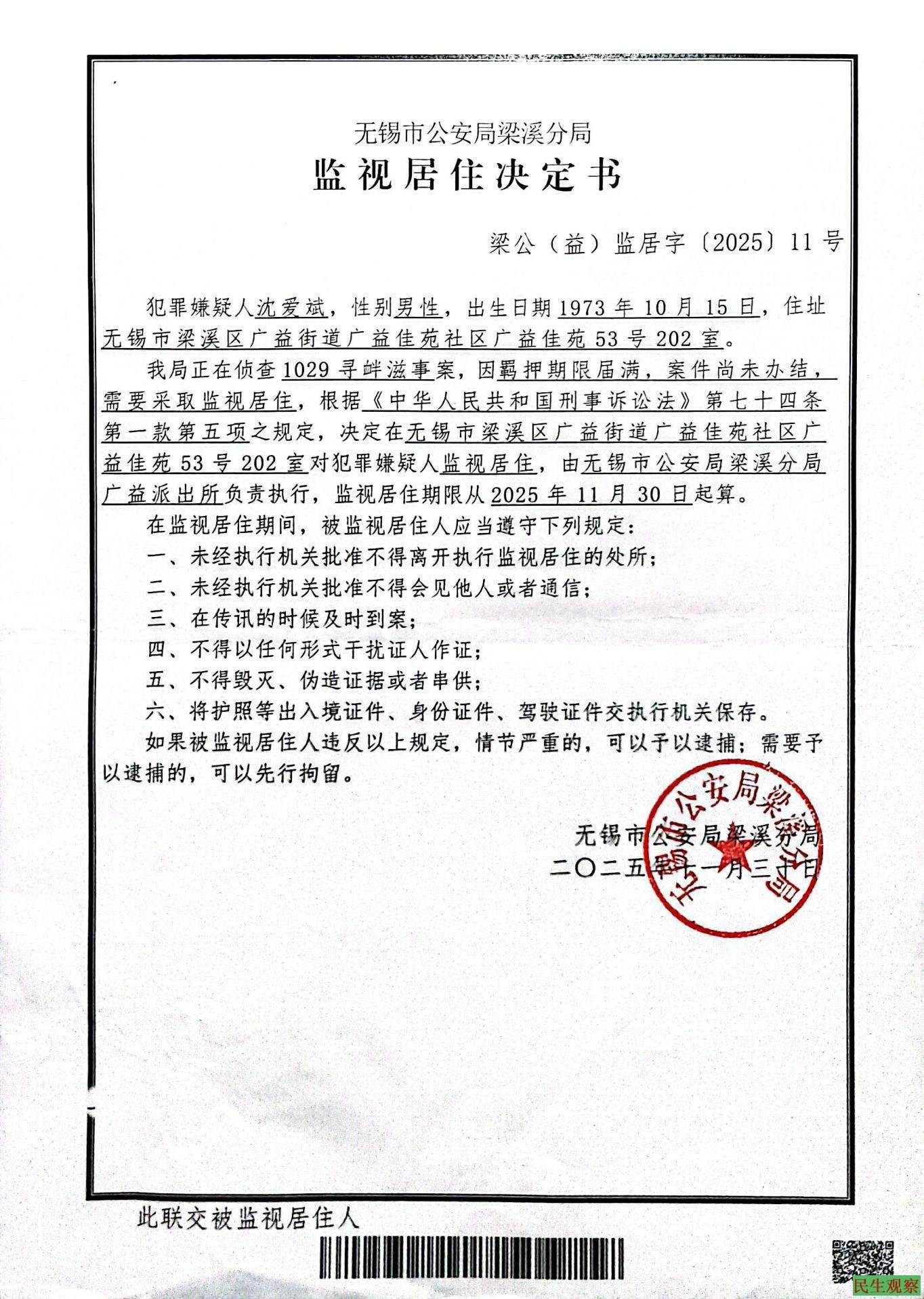 被监视居住日期:2025年11月30日,释放当日