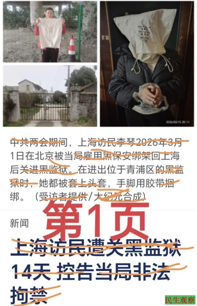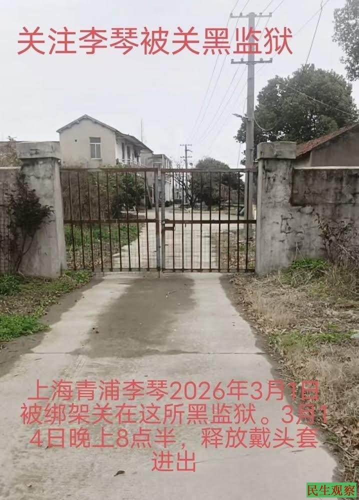 【民生观察2026年3月25日消息】上海青浦区金泽镇维权访民李琴,每到中共两会期间都会被关黑监狱。今年两会期间中共为了维稳,在没有任何执法文书的情况下将李琴套头强行带走,非法拘禁半个月后扔到野外的高架桥下。获释后,李琴于近日通过视频控诉当局的罪恶,并向上级部门递交了刑事控告书,要求依法追究金泽镇政府及公安长期多次对其非法拘禁、滥用职权、非法搜查、侮辱、虐待、毁灭证据的刑事责任。
