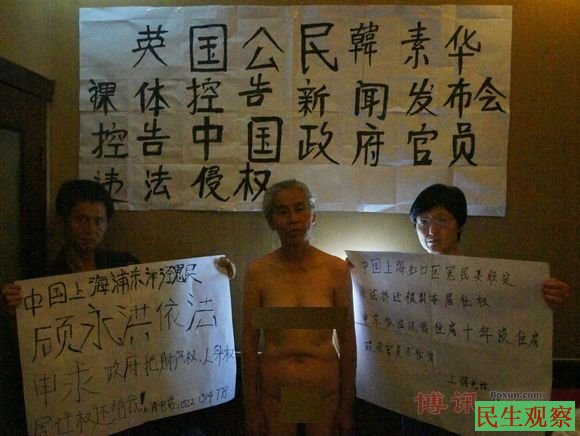 民生观察工作室2013-8-5消息:近日,在北京的英国籍访民韩素华裸体抗议酷型、抗议非法关押。这是又一起发生在访民中的裸体非暴力抗争方式,引起了媒体的关注。