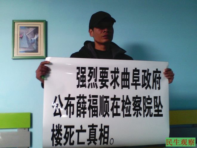 今天晚上,黄宾、郭建和、马胜芬、冉崇碧、刘辉等从徐州过来的观察团成员到达济南,与这里的多名人员汇合,人数达到二十多人。到济南火车站后,张圣雨、郭建和、马胜芬、冉崇碧、刘辉,余建芳就在火车站进行了举牌活动,要求公布薛福顺死亡真相。
