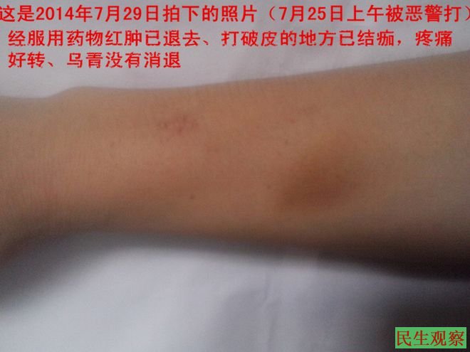 民生观察工作室2014-7-29按:浙江维权上访人、被精神病者钟亚芳三年来一直遭到浙江桐庐县当局指派的多名人员的严密监控制,为此她向桐庐县当局提出撤消监控人员的要求。2014年7月25日,钟亚芳就这一诉求到桐庐县公安局信访科要答复,谁知因拍照遭到警察陈家鲁、沈全根的殴打,下面是根据当时的全程录音整理的文字和图片。