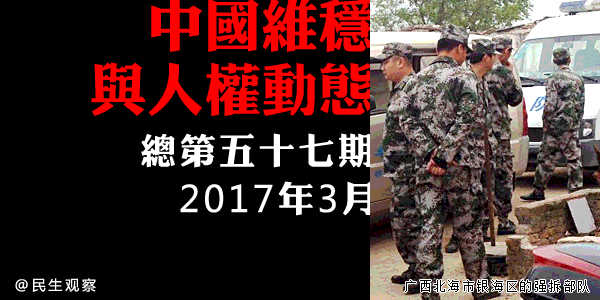 本月由于“两会”在京召开,当局对于民间的打压也可谓“盛况空前”,受此影响至少有344位人士遭不同的程度的镇压。与此同时,“709大抓捕”的风暴持续不断,其受害者的家属受到反复的骚扰——江天勇律师的父母被要求配合政府,强迫他们录制让儿子认罪视频。王全璋律师的妻子李文足、李和平律师的妻子王峭岭也频繁受到威胁与恐吓。还有在中国探亲的澳大利亚悉尼科技大学中国学教授冯崇义返回澳大利亚时被限制出境,当局给出的理由也非常荒唐,竟是涉嫌“危害国家安全”。有评论认为,中国限制冯崇义出境会在海外学者中产生寒蝉效应,威胁海内外学者的研究工作。当然台湾NGO工作者李明哲在大陆遭遇强迫失踪后进而传出被捕的消息,则是当局对公民社会的打压已延伸至海外的具体表现。据本工作室的不完全统计,综合本月179个维稳案例,其中至少有位513人士受到程度不等的维稳和打压。