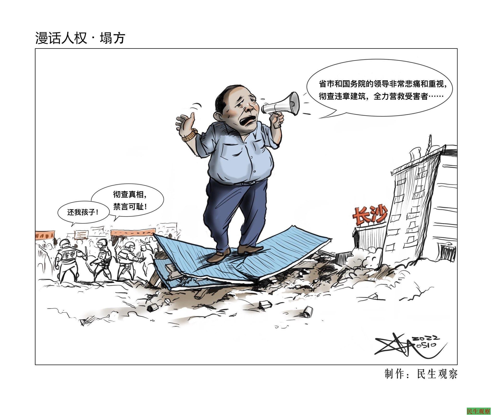 4月29日长沙坍塌事故,5月6日搜救结束,救出10人53人丧生,53人大部分是长沙医学院的大一学生十八九岁。长沙市委书记和市委道歉及中共国务院成立调查组等,其他官方则是一概回避。官方还清空事故楼房附近的高楼层宿舍,避免遗体运送被拍摄记录,家属被消音。