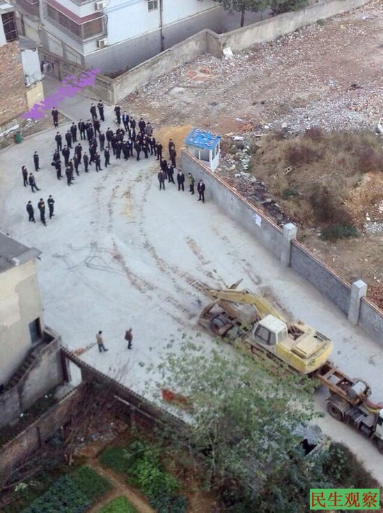 民生观察工作室2013-11-29消息:湖南一维权人士刚刚给本工作室发来消息称,此时此刻,湖南株洲政协正在强拆当地民宅。他现在就在强拆现场附近围观,约半小时前,他看到株洲当局派来的挖掘机直接推到了被拆迁户的房屋,连里面的人都不知道出来了没有。那栋被拆迁房的旁边就是株洲市政协所在地(位于湖南湘江边)。据周围群众反映,株洲政协近期在该地新建了办公楼以后,又想在此新建他们的福利房,由此,政协就想征收这块地供自己使用。而该地的居民楼也是新建没几年属于比较新的房屋,许多居民因此不愿意拆迁。但是,政协使用各种手段,最终迫使许多居民一个个无奈的拆迁搬走了,仅剩下一户叶姓人家,坚持不肯拆迁。今天,株洲政协在未协商成功的情况下,就直接调来大型挖掘机和数十名强拆人员,来到该地对这户叶姓人家的房屋实施暴力强拆。据悉,住户家中有人被打伤。在强拆的过程中,当局还不准人们拍照,有2名群众因为拍照强拆现场而被抓走,湖南的这位维权人士也只能无奈的跑到附近一座高层建筑内,对今天的强拆现场进行了远距离拍照。