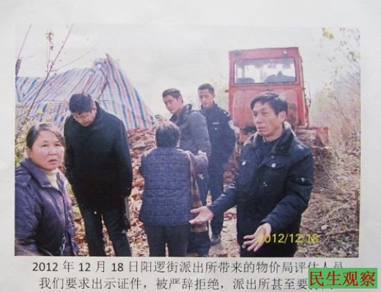 按照我国《刑法》规定,故意毁坏公私财物达到五千元以上的,就应予以刑事犯罪立案追究。我们一直要求阳逻街派出所立案,但派出所所长说,他们不可能立案,也不敢立案,并说这是政府行为。为此,我们找到湖北省公安厅、武汉市公安局以及新洲区公安分局,要求督办立案调查。武汉市公安局也多次向新洲区公安分局下发通知单,要求立案调查,但他们一直不立案。不仅如此,阳逻街派出所甚至和阳逻街道串通一气,拿着“拆迁办”伪造的假拆迁合同讹诈我们,谎称我们在2009年在拆迁合同上签了字。这时我们才发现伪造签字的假合同,要求进行司法鉴定。结果他们把那份假合同从我们手中抢走。试问我们如果真在2009年签了拆迁合同并得到补偿到位的话,那么完全可以公开拆除,何苦到2012年12月13日深夜将我们的房屋偷偷强行拆掉?