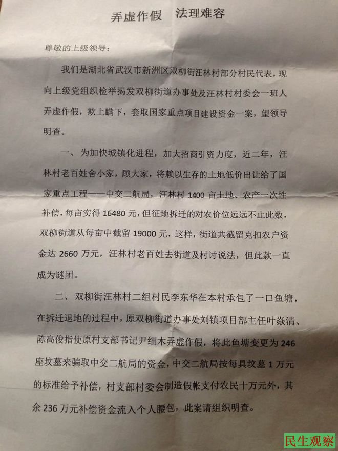 武汉新洲区汪林村失地农民进京上访诉当地 “弄虚作假”