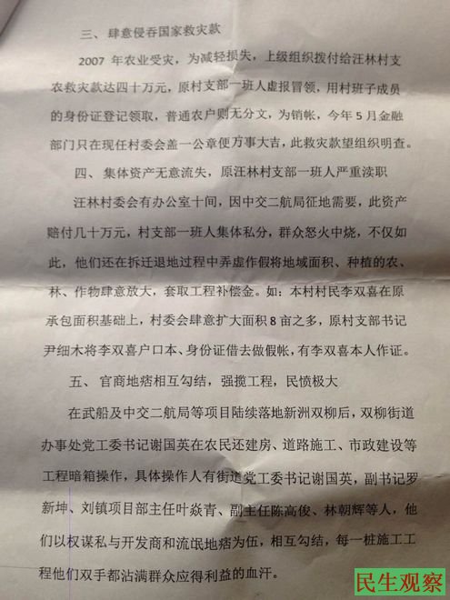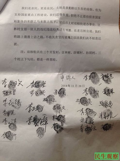村民们反映该村1400亩土地被征占,农民每亩只获得16480元的补偿,街道共克扣农民2660万元。另外村民们还反映了集体财产流失、当地侵吞救款、官商勾结等问题,具体请看附后的村民的举报信。