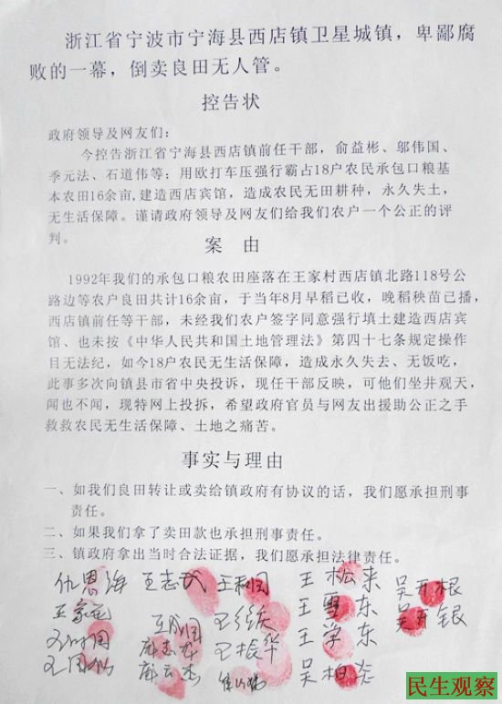 浙江宁海十八户村民 联名控告村干部暴力强征粮田 |