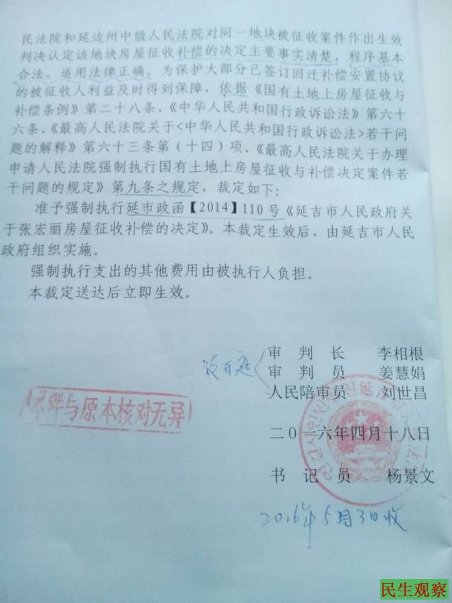 今天,张宏丽说她刚刚要到了延吉法院的裁定,称明天就要对她家房子进行强拆。张宏丽表示她还是相信法律,今天下午正急着赶往法院进行上诉。